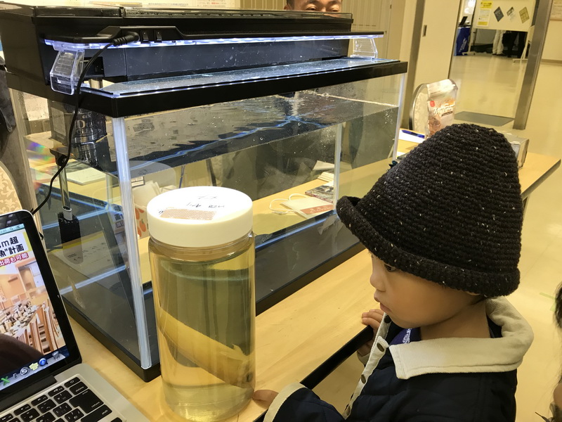 有瀧教授が研究を行っているテッポウギスの標本を見入る男の子は、魚の標本を見る機会が少ないためか、近くに寄ってきてじっくり見ていました。水槽で泳いでいるのはシロギスですが、よく見ると名前の様に「シロ」ではなく、少し「クロ」くなっています。