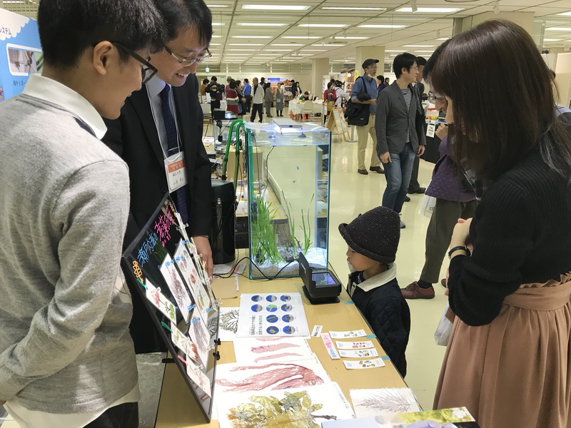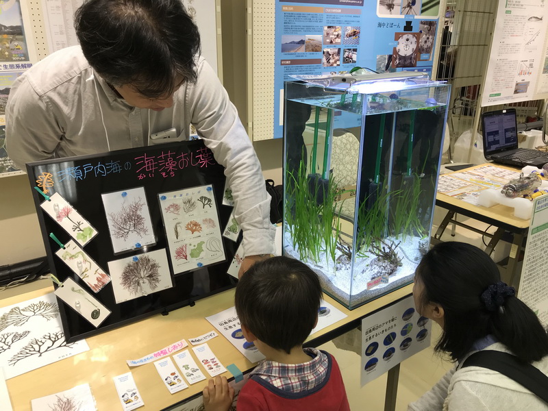 藻場の生物環境や役割を紹介する研究コーナーでは、藻場をイメージしてレイアウトされた水槽の中をタツノオトシゴ、カワハギ、エビなどが気持ちよさそうに泳いでいました。また、色とりどりの藻類が綺麗に標本されて展示されていましたので目を引いていました。