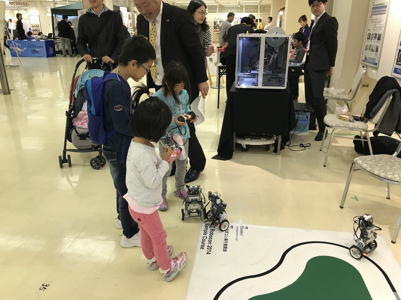 沖准教授指導のもとで大学院2年の角野君が大きく携わって開発した、画像処理によってライン上を無人で移動するモデルシステムも出展されました。床のラインを台車の前で光っている部分に取り付けてあるカメラが撮影し、同時に本体で撮影した画像の情報処理を行いながらライン上を時速3kmで移動します。