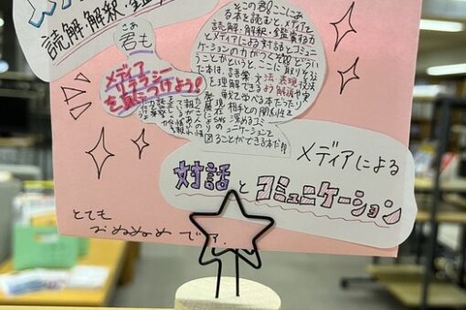 このように、①「メディアを読解・解釈・鑑賞する力」と「メディアによる対話とコミュニケーションの力」、②「メディアを使いこなす能力」と「考えをメディアで表現する能力」というテーマのもと、学生による選書が行われ、選んだ本の紹介POPを作成し、図書館内の什器を使用して資料とPOPの展示が行われました。