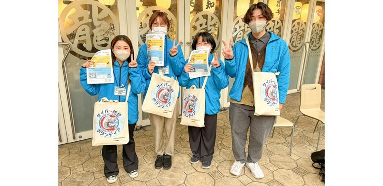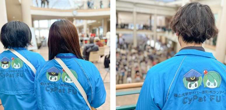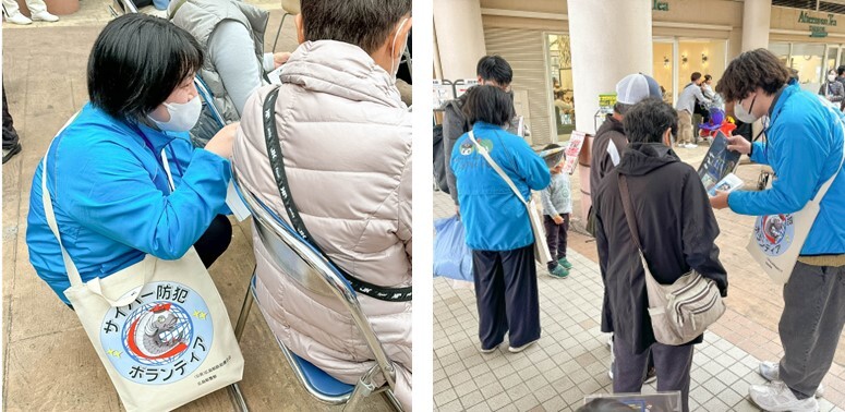 CyPat FUのメンバーは、いつものスカイブルーのユニフォームを着て、サイバー犯罪対策課の方に用意していただいた「サイバー防犯ボランティア」のバッグを持って、フィッシング詐欺とサポート詐欺に関する注意喚起のビラを配りました。もちろん、自分たちの活動を紹介するチラシもしっかり持参して、一緒に配らせていただきました!