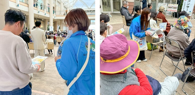 音楽隊の演奏中は、お客さんもメンバーも音楽を聴いて、曲と曲の間に素早くビラ配りを行いました。