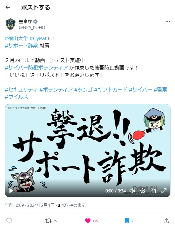 今年度の広報啓発コンテストのテーマは、「ID・パスワードの設定と管理」と「サポート詐欺対策」。CyPat FUは今年度は「サポート詐欺対策」に関する動画を作成し、応募しました。先月無事予選審査を通過し、現在X上での本審査に出場中です。