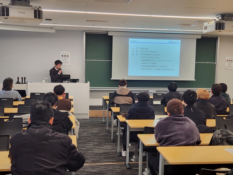 摩擦撹拌接合とは、二つの材料を回転させながら押し付けることで一体化される接合法の一種です。摩擦撹拌接合を製品に適用し、コンパクト化が実現した例が紹介されました。このような接合方法を知らない学生がほとんどでしたので、たいへん興味深そうでした。