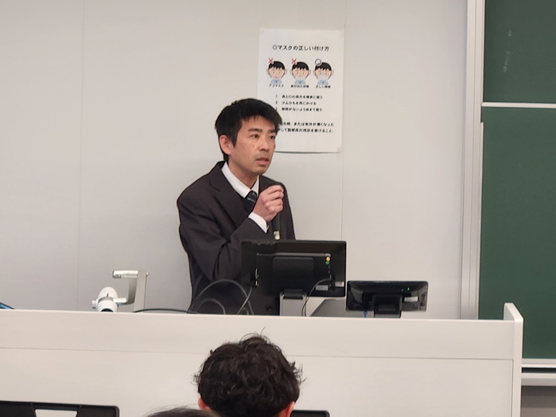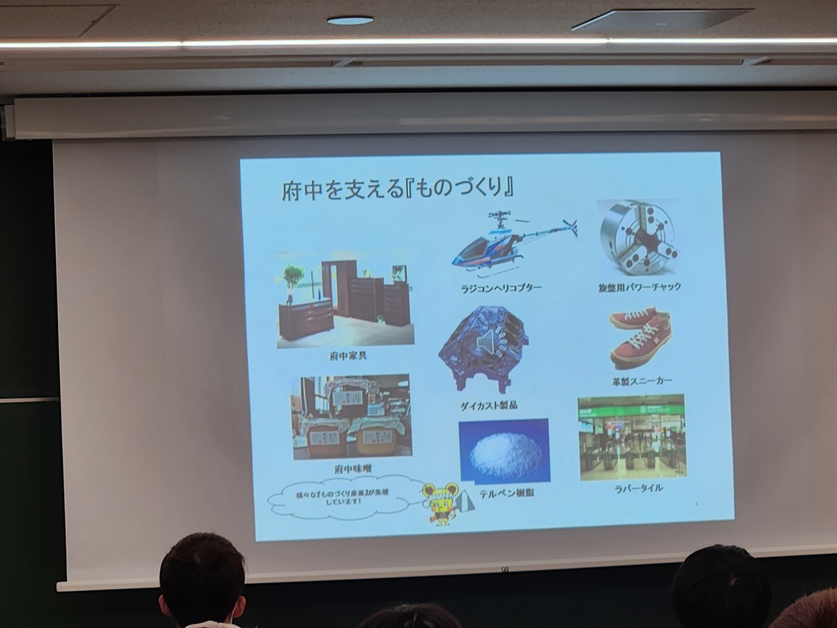 最後は府中市商工労働課様の御講演です。府中市の紹介から始まり、府中市の名物料理、府中焼などが紹介されました。さらに、機械システム工学科も運営に参加している第15回全日本EV & ゼロハンカーレース in 府中の紹介もありました。