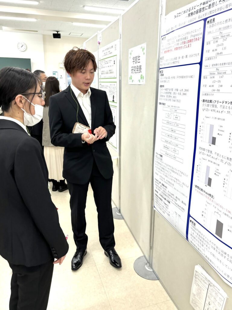 石井 荘さん(医療心理学研究室3年・鳥取県立智頭農林高校出身)は、「大学生におけるスピーチ場面の不安に対するPMRの効果」というタイトルで発表しました。石井さんは、スピーチにより高まった不安が漸進的筋弛緩法(Progressive Muscle Relaxation: PMR)を用いることで、軽減するかどうかについて検討しました。スピーチ課題は、参加者の皆さんにもハードルが高く、参加者の募集にとても苦労したそうですが、石井さんの熱意が伝わり、たくさんの人に協力してもらって何とか発表にまとめることができたようです。