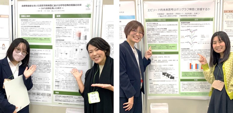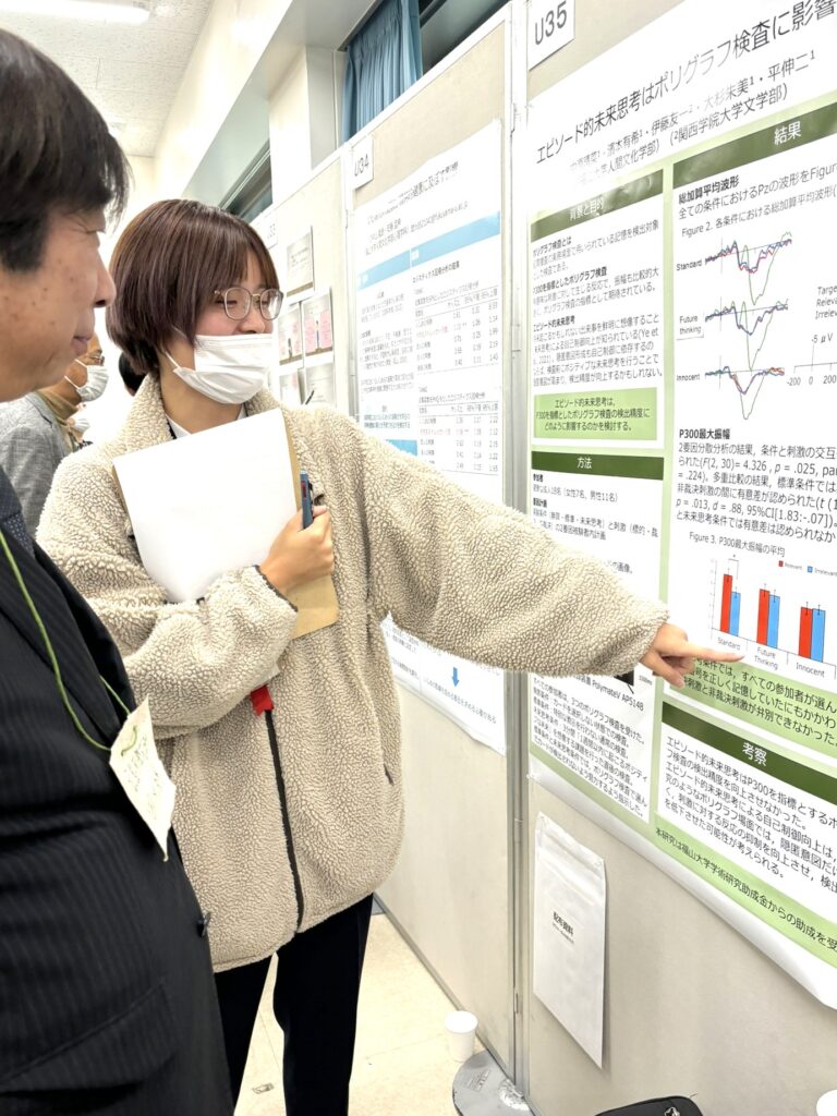中原晴菜さん(2年生・福山暁の星女子高校出身)は、「エピソード的未来思考はポリグラフ検査に影響するか」というタイトルで発表しました。エピソード的未来思考とは、将来起こるかもしれない出来事を鮮明に想像することを指します。エピソード的未来思考を行うと、自分をコントロールする能力が向上することが分かっています。中原さんは、ポリグラフ検査の直前にエピソード的未来思考を行うことで、盗んだ品物に関する記憶の検出が困難になることを明らかにしました。学部2年生から学会発表に挑むと聞き驚きましたが、中原さんは1年生の時から様々な学会に参加し、学会の雰囲気を少しわかっていたこともあり、すっかり落ち着いて説明することができました(実際は、とても緊張していたそうです)。