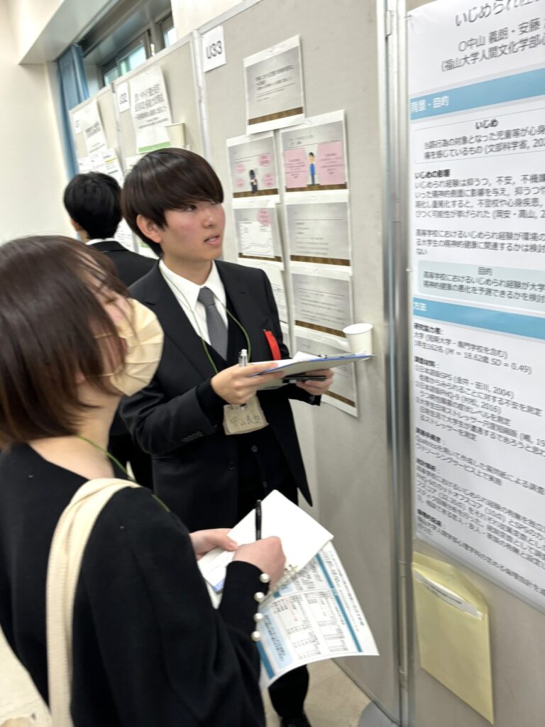 中山義朗さん(医療心理学研究室3年・並木学院福山高等学校出身)は、「いじめられ経験が精神的健康に与える影響」というタイトルで発表しました。中山さんは、環境の変化のある大学1年生を対象とした調査を行い、高等学校でいじめを受けた経験の有無が抑うつ気分や不安といった大学生の精神的な健康に与える影響について検討しました。その結果、いじめられ経験の有無と大学生のストレスとの関係を明らかにすることができました。今後は、もう少し詳しく、どのような経験がどのようなストレスと関連していくのか深堀していく予定だそうです。