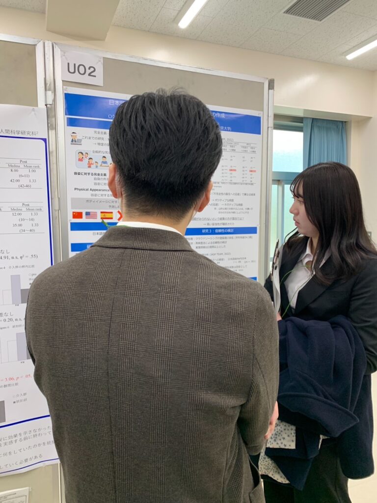 久原璃子さん(認知心理学研究室4年・佐賀県立白石高校出身)は、「日本語版Physical Appearance Perfectionism Scaleの作成―妥当性と信頼性の検討―」というタイトルで発表しました。昨年に引き続き、「容姿に対する完全主義」を測定するPAPSという尺度の翻訳、そしてその翻訳した尺度項目の妥当性と信頼性を検討していました。前日までしっかり練習をした成果をばっちり発揮して、とてもスムーズに説明ができており、先生たちに褒められて嬉しそうにしていました。久原さんは、外部の大学院に進学が決まっていて、進学後には自身が作成した尺度を用いてボディイメージの不満足感との関連を明らかにしていくそうです。