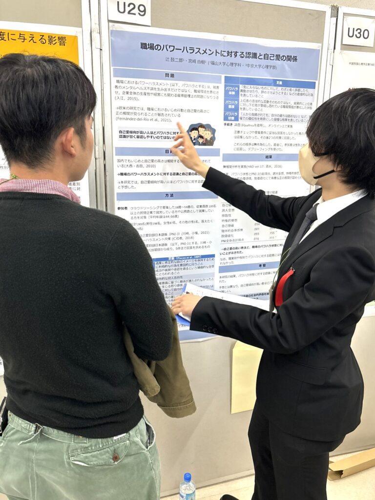 辻 鼓二郎さん(認知心理学研究室3年・愛媛県立今治南高校出身)は、「職場のパワーハラスメントに対する認識と自己愛の関係」というタイトルで発表しました。辻さんは、自己愛傾向の強い人は、パワハラに対する認識が甘く、パワハラを容認しやすいのではないかと予測し、研究を行っていました。しかし、予想とは異なり、自己愛傾向が高い人はパワハラに対する認識が厳しいという結果が得られたようです。発表では、反対の結果が得られた要因についても議論していました。本番1分前まで緊張しており、会場内を徘徊していたようですが、議論が進むにつれて緊張もほぐれ、とても楽しそうに発表ができていました。