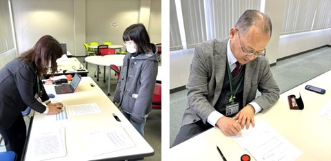<修士論文を提出する研究科2年生の皆さんと押印する平研究科長