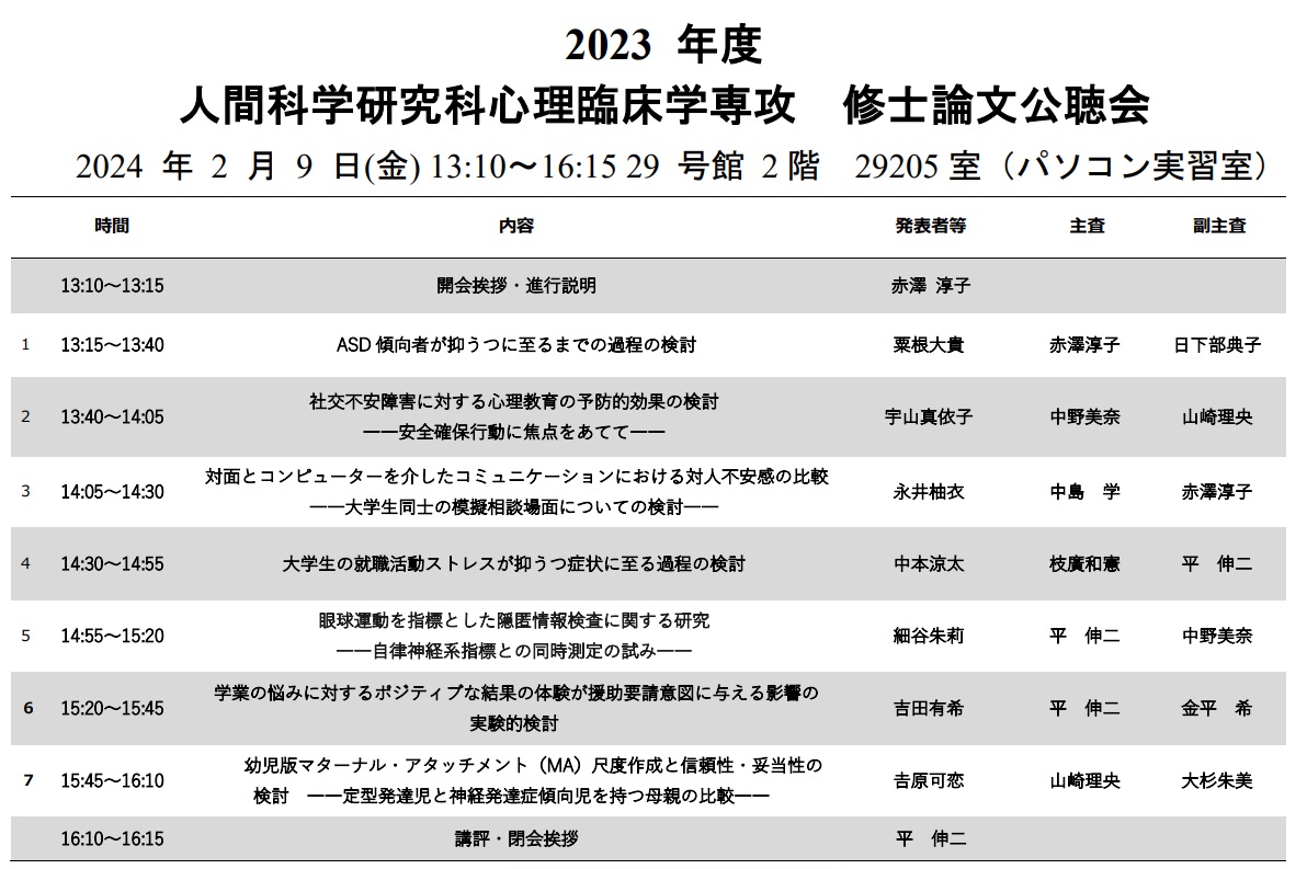 公聴会での審査を終えた2年生ですが、つい先日は公認心理師資格の国家試験を受験し、緊張の2月を過ごしました。4月からは、病院や福祉施設での専門職や、心理学の専門的素養を身につけた警察官として、新しい生活をスタートさせます。分野は様々ですが、2年間講義や実習を通して学んだ知識やスキル、研究を通じて掴んだ科学的思考や分析力を大いに活かしながら、活躍してくれることと信じています。