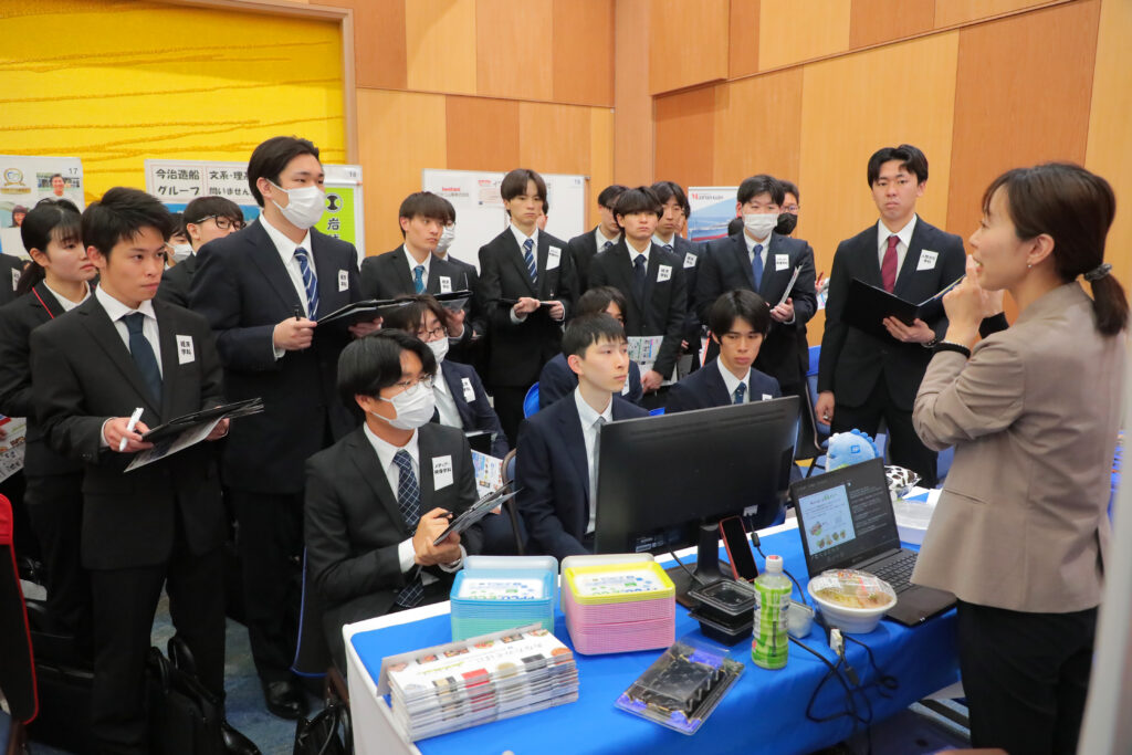 様々な業種・業界の企業が参加しています。学生たちは終始メモを取りながら、真剣な表情で採用担当者の説明を聞いていました。