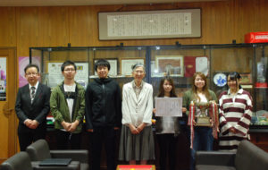 広島県学生弓道男女リーグ戦の女子団体優勝の報告と中四国大会の男子団体予選を4位で通過し、来年6月に開催される全国大学弓道選抜大会出場推薦校へ選ばれたことの報告に、学長室を訪問しました。
