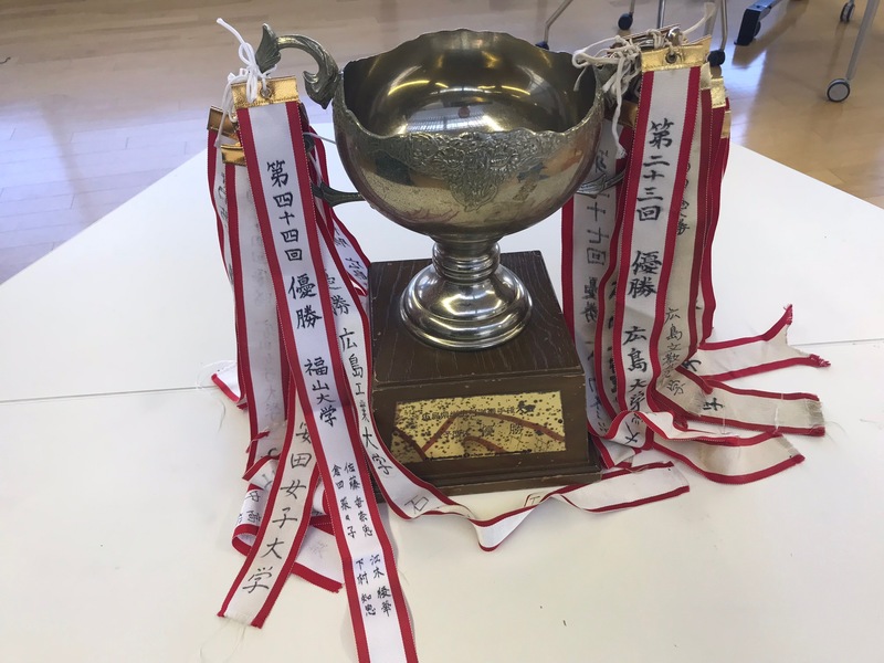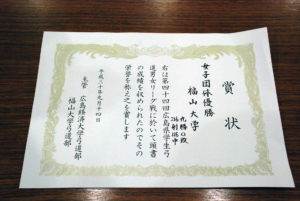「弓道部創部以来、男女とも県リーグでの優勝はなく優勝カップのリボンには他大学の名前ばかり結ばれていました。しかし、今年はその中に福山大学のリボンを並べることができました。」と報告できました。