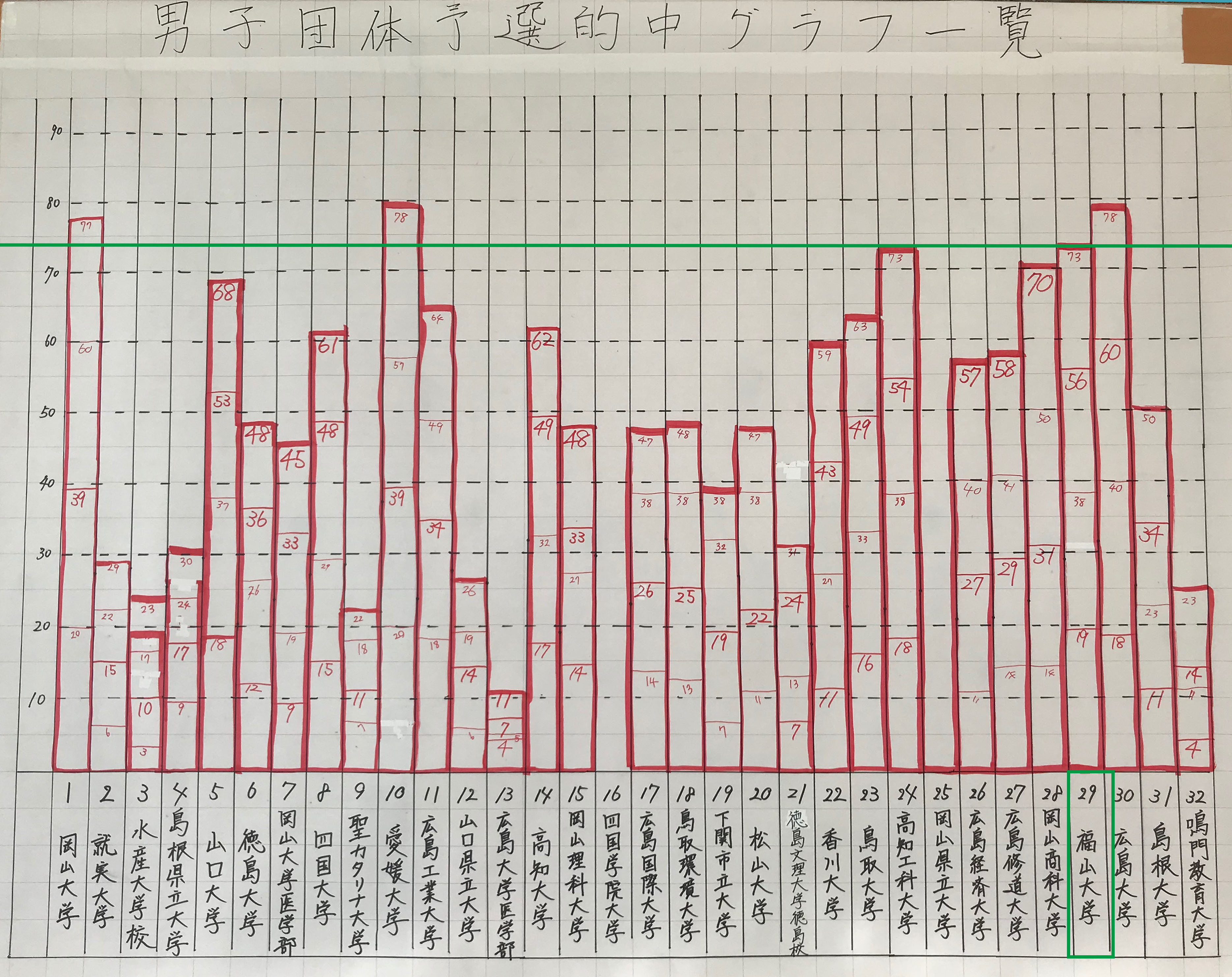 予選は、男子1チーム6人×4本×4立で競います。その結果、4立終わって高知工科大学と同じ総的中数(73本)でしたが、1立目の的中数が福山大学(19中)、高知工科大学(18中)と福山大学が1本的中数が良かったので、4位で通過となりました。どの1本も大切な1本ですが、終わってみれば、この1本が全国大学弓道選抜大会出場推薦校への切符を運んでくれました。(全国大学弓道選抜大会へ中四国地区より選出されるのは予選上位4校です。)