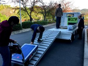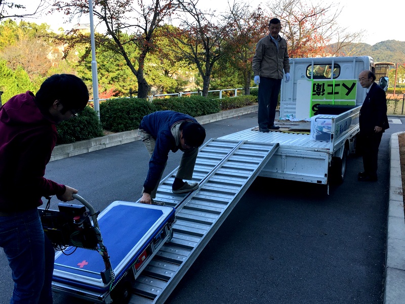 前日の金曜日の朝、沖准教授、田中准教授、香川教授、仲嶋教授と学生有志の面々で、搬入作業を行いました。今回はかなりの重量がある自動運転カートや海底カメラなどを展示しますので、トラックへの積み込み作業から始まります。この他にも、多数の研究紹介用のパネルを準備して毎年のことながらイベントに対して大変気合が入っています。たくさんの人に見てもらって盛況な場になれば、、、と祈りつつの準備作業でした。
