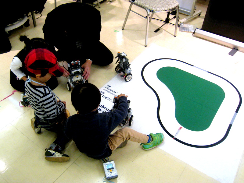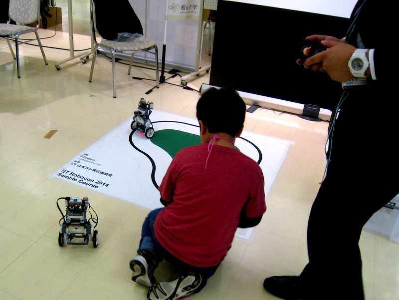 また、上の写真では切れていますが、ブースの手前には、みらい工学プロジェクトのETロボコンで使用している走行体ロボットをリモコン操縦にしてお子さんに遊んでもらえるようなエリアを作りました。自分でロボットを動かせるというのはやはり大人気で、たくさんの子供さんで賑わいました。