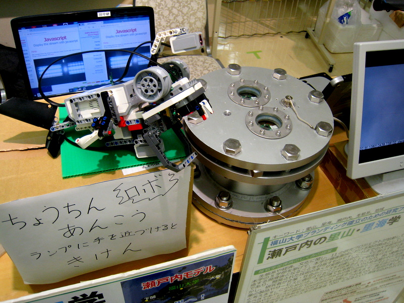 このブースで人気だったのは、レゴブロックで組み立てられた手を近づけるとセンサが感知して口をパクパクするちょうちんあんこうロボ、実はこのロボットは海底カメラの計測実験に従事している田中研究室のゼミ生の村上くんの作ったものです。どうやら村上くんはレゴビルダーとしての才能があるようで、今後にも期待です。