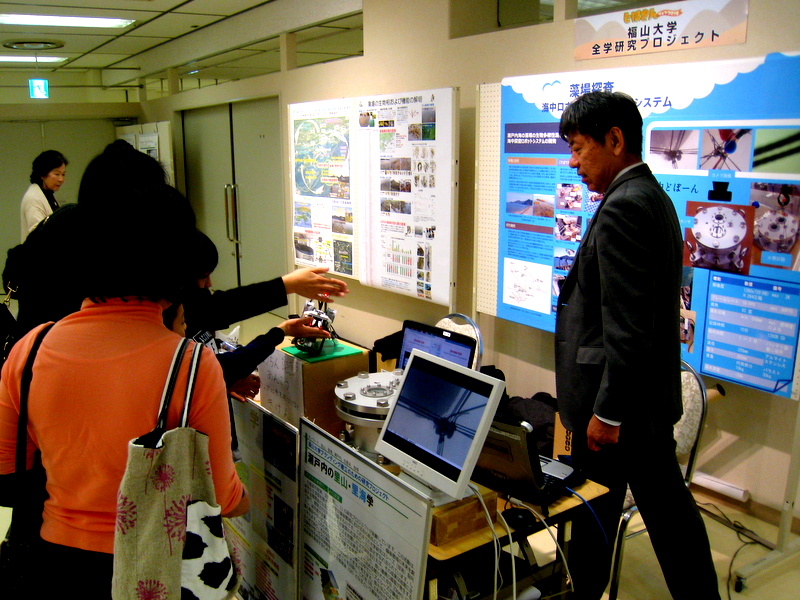 通路の対面ブースでは、福山大学全学研究プロジェクトとして里海・里山プロジェクトが紹介されていました。今回は、海底カメラなどの「海中どぼーん」の実物と前回のブログで紹介した海底カメラ映像のビデオを展示し真下。仲嶋教授には来場者の方からたくさんの質問が飛び、高い注目度であることが伺えました。