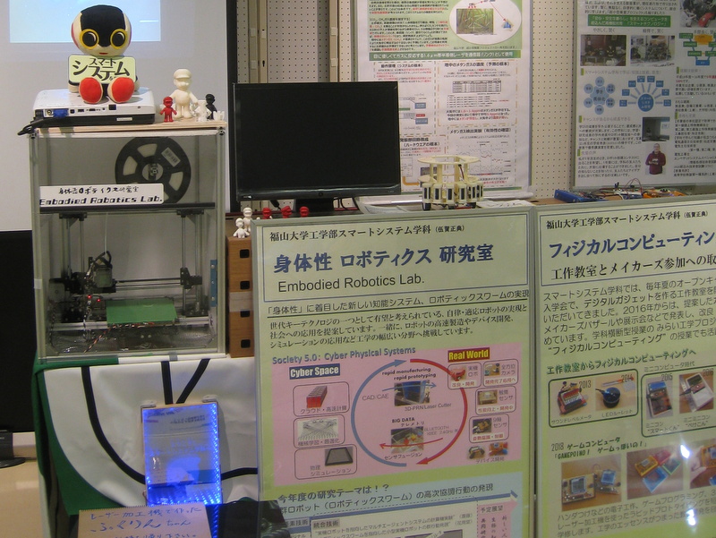 毎年、このじばさんフェアには、地元の企業から多くの興味深い展示がありますが、昨年、一昨年と3Dプリンタを持ち込み展示しているブースが見受けられました。私の研究室でも同じような3Dプリンタの稼働展示ができないか?ということを考えてきましたが、今年度は当研究室のゼミ生の花見堂くんが中心となって、持ち運び可能なように3Dプリンタのコンパクトな作業ケースを開発してくれて、今回の展示をすることができました。3Dプリンタやレーザー加工機を用いて、計算機でデザインしたロボットや造形物をすぐさま現実世界に作り出すラピッドプロトタイピングは、これからのキーテクノロジーになるでしょう。また、私が担当している工作教室や田中准教授と情報工学科の山之上教授と担当しているみらい工学プロジェクトの「フィジカルコンピューティング」の紹介展示も行いました。