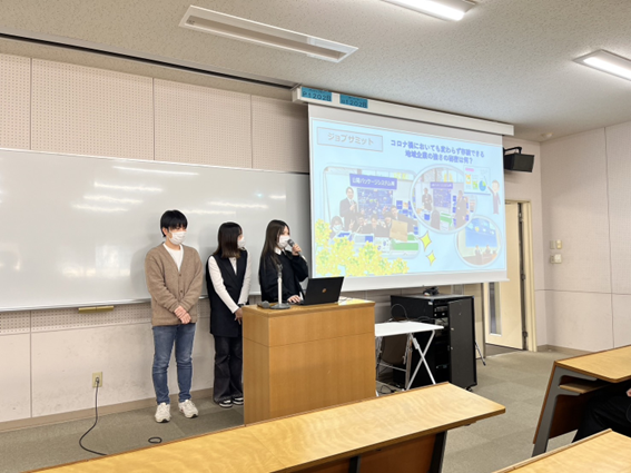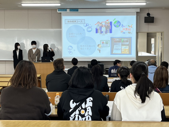 ゼミは勉強だけではなく楽しい活動もいっぱいあります。私(上原)と池田琉星さん(山口県・桜が丘高等学校出身)は高羅ゼミのメンバーと参加した10月の三蔵祭、11月のローカルジョブサミット、12月・1月のゼミで行われた卒業生との交流会について説明しました。