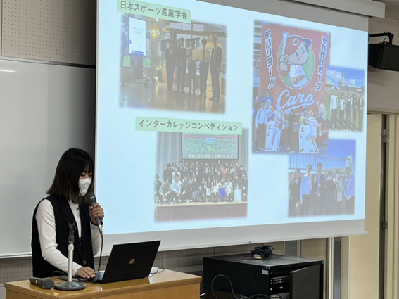 3年生から本格的に始まったゼミ。体験談を交えながら、高羅ゼミと藤本ゼミの活動内容を紹介しました。井尻恋さん(広島県・盈進高等学校出身)は藤本ゼミのメンバーと参加した7月の日本スポーツ産業学会と12月のインターカレッジコンペティションでのプレゼンについて説明しました。
