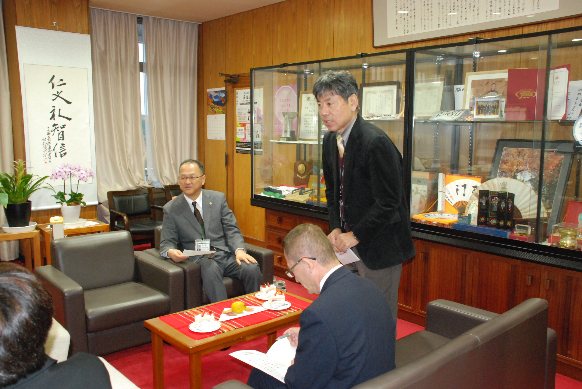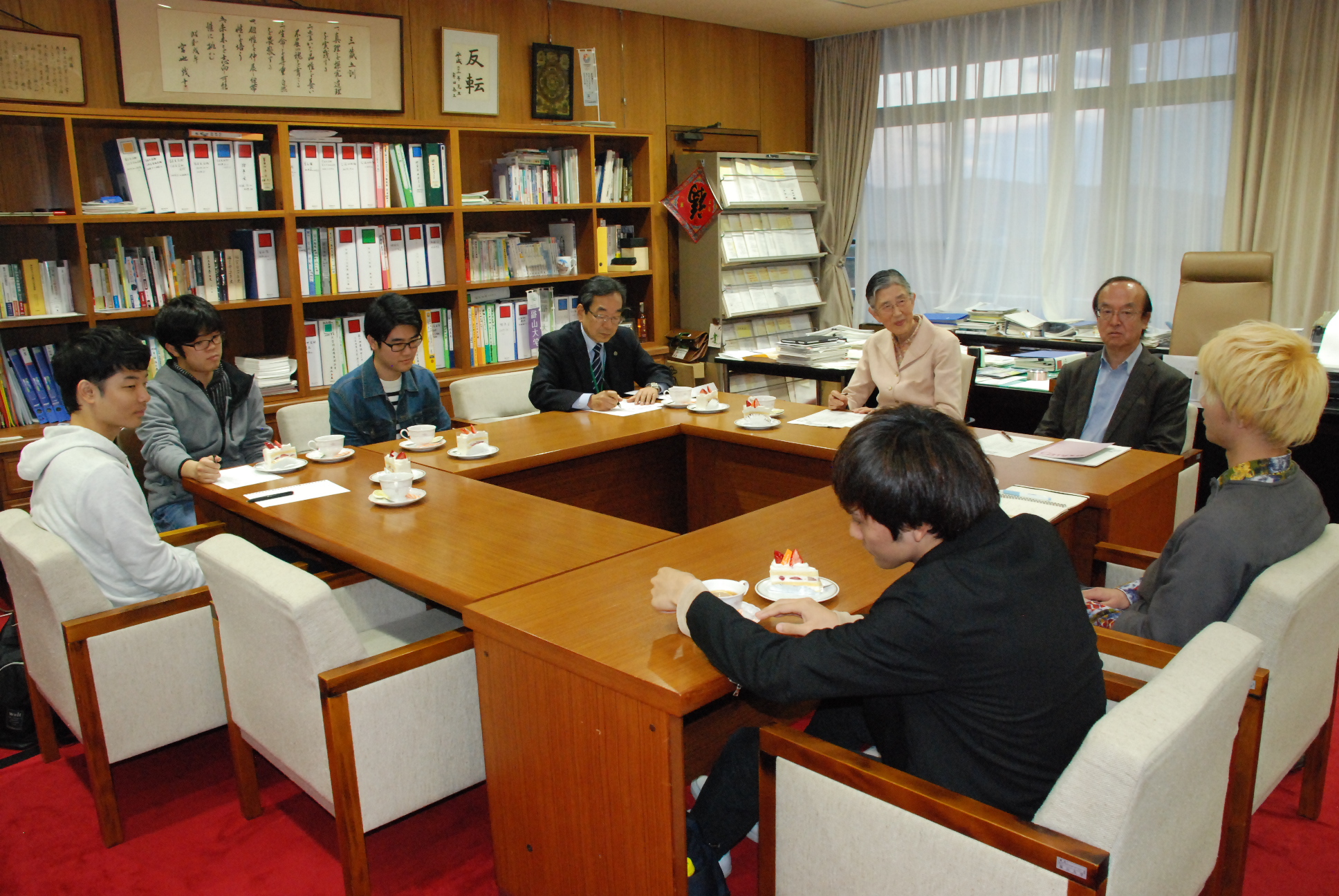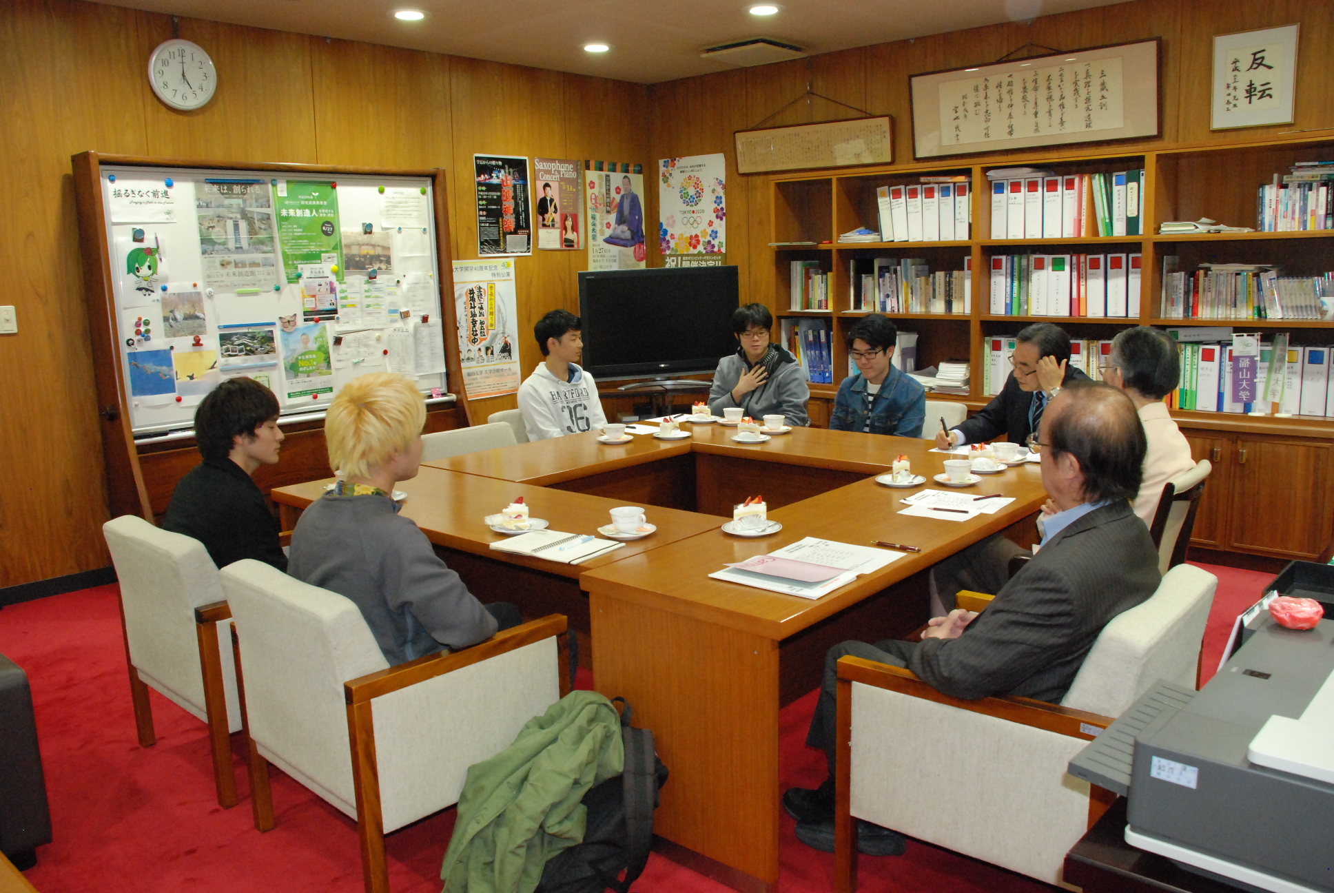 今年も学生達が学長に、今がんばっていることやこれからの抱負などを語る会を5回に渡って開いています。学生課に事前に申し込めば、誰でも参加できます。第1回の11月19日には、6名の学生が訪れてくれました。2年生5名は、工学部建築学科(前田君、矢田貝君)、情報工学科(竹川君)、機械システム工学科(奥君、ちょっと遅れたので、写真には写っていません)、経済学部税務会計学科(細井君)と所属学科はバラエティに富んでいますが、実は5人とも三蔵祭の委員で、来年の三蔵祭を担う人たちです。はじめはどちらかというと押しつけられた役目だったようですが、いまやとても真剣に考えてくれていて、感動しました!来年の三蔵祭は、今年以上に充実したものになりそうです。