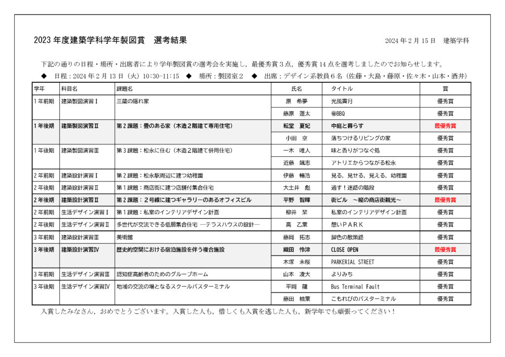 学年製図賞というのは、1年生から3年生までの建築設計製図の演習課題を対象に、優秀作品を表彰する建築学科の取組です。年度末にデザイン系の教員中心に賞の選考会が行われ、各学年から最優秀賞1点、優秀賞4〜5点が決まりました。受賞者には新年度のオリエンテーションで、クラス担任やゼミ担任から賞状が手渡されました。