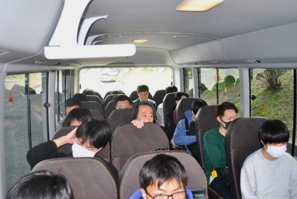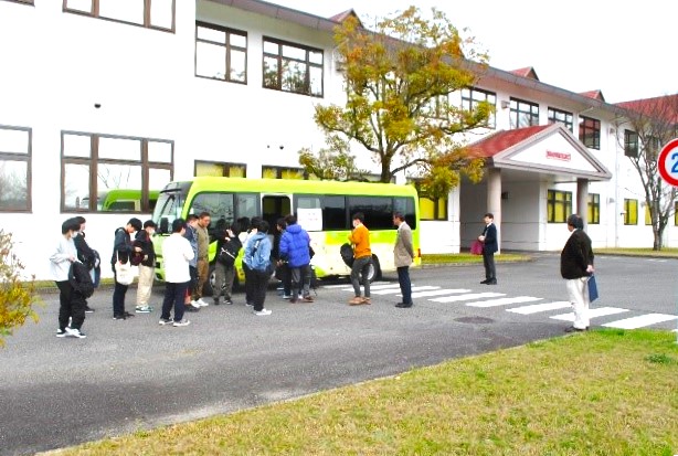 電気電子工学科では、電気電子に関する幅広い分野を学びます。今回、企業見学でお邪魔したのは、そのうちの半導体、電子回路、メカトロニクス、制御、機械システムと関連の深い会社です。参加したのは新入生全員と2年生の希望者でした。学生の皆さん、引率の教員と一緒にマイクロバス1台で行ってきました。朝8:50分に大学のバス停「緑のこかげ」に集合です。