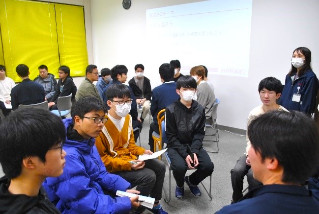 その後、2班に分かれて製造装置の開発や組み立てなど工程を見学し、装置の動くところをデモンストレーションしていただきました。このときは、装置外装の一部を外してあり、内部まで見せていただけました。ただ、この辺りは企業秘密もあり、写真撮影は禁止でした。社内を見学しているときの学生は初めて見るものとその説明で、興味津々、とても楽しそうでした。装置のデモンストレーションでも近くに寄って詳しく見ようとしたり、内部の回路や部品について質問したりと、学生のみなさんの今後の伸びしろが楽しみです。社内を一巡した後、入社2面目の社員の方々と座談会を行っていただきました。