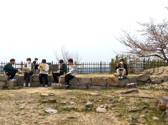 次に、学校法人福山大学社会連携推進センターに行き、ここで昼食休憩としました。入学式の時は雨でしたが、この日ははまずまずの天気。一時解散し、お弁当を持って福山城で花見を楽しみました。