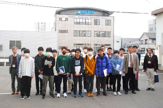 到着後、代表の方からご挨拶をいただきました。お話は社長の学生時代の経験や仕事についてからのこと、会社の創業時の様子から現在までのことなど、幅広くお話しくださいました。次に会社の概要について説明していただき、こちらでも2班に分かれて社内を見学しました。こちらも、もちろん、社内見学の写真は禁止です。社内の開発、試作、テスト、検査など、さまざまな部署を間近かで見学しも、途中では当学科のOBが仕事をしている様子も見ることができました。