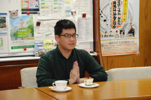 実は、西原君は平学長補佐のゼミ生であり、小学校へ出向いて地域安全マップの指導を行うPACE福山支部のメンバーです。PACE福山支部は、赤い羽根共同募金による社会課題解決プロジェクトの認定団体であり、西原君は来年度のプロジェクトリーダーも務めるそうです。1年生の時に来室してからこの2年間、とても充実しているという嬉しい言葉も聞かれました。来年は、卒論、就活、ボランティアが2つといずれも大変な活動ですが、健康に気をつけてしっかり乗り切ってください。その姿に後輩たちがきっと名乗りを上げてくれることでしょう。