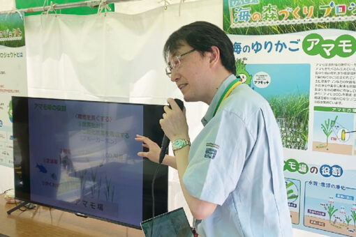 アマモを学ぶミニトークは、「アマモってどんな植物?」「なぜアマモを増やすの?」という内容で、各日3回ずつ山岸が行いました。実物のアマモの観察や、アマモ場にすむ生き物の動画などを交えて、海の森についてわかりやすく学べるようにしました。