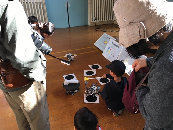 私たちのロボットコーナは体育館の一番入り口で目立つところに設定されましたてが、その体育館では地元産の野菜や果物の展示、書画、絵画といった地場文化的な雰囲気の前面に置かれているためか、開場直後にご来場されたご年配の方々からうさんくさげな視線を浴びていました。しかし、親子連れの子供達が増えてロボットで遊んでもらえるようになってやっとロボットコーナーらしくなってきました。