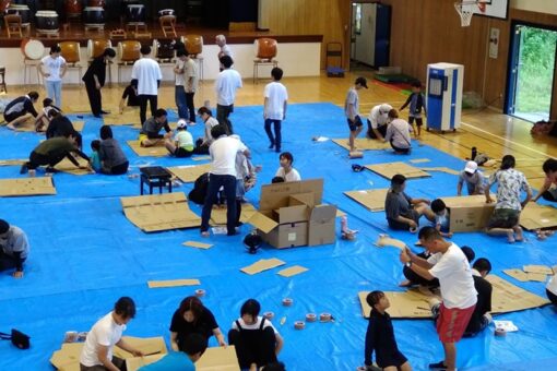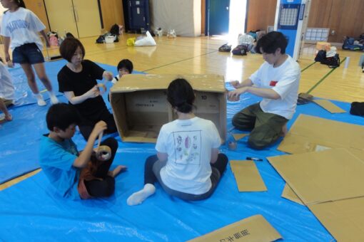 限られた段ボールと布テープで、段ボールの構造や船の構造などを確認しながら制作を続けていきました。参加している子どもたち、保護者の方々、スタッフとして参加している鷺浦小学校の先生方の誰もがすべて笑顔だったのが印象的でした。
