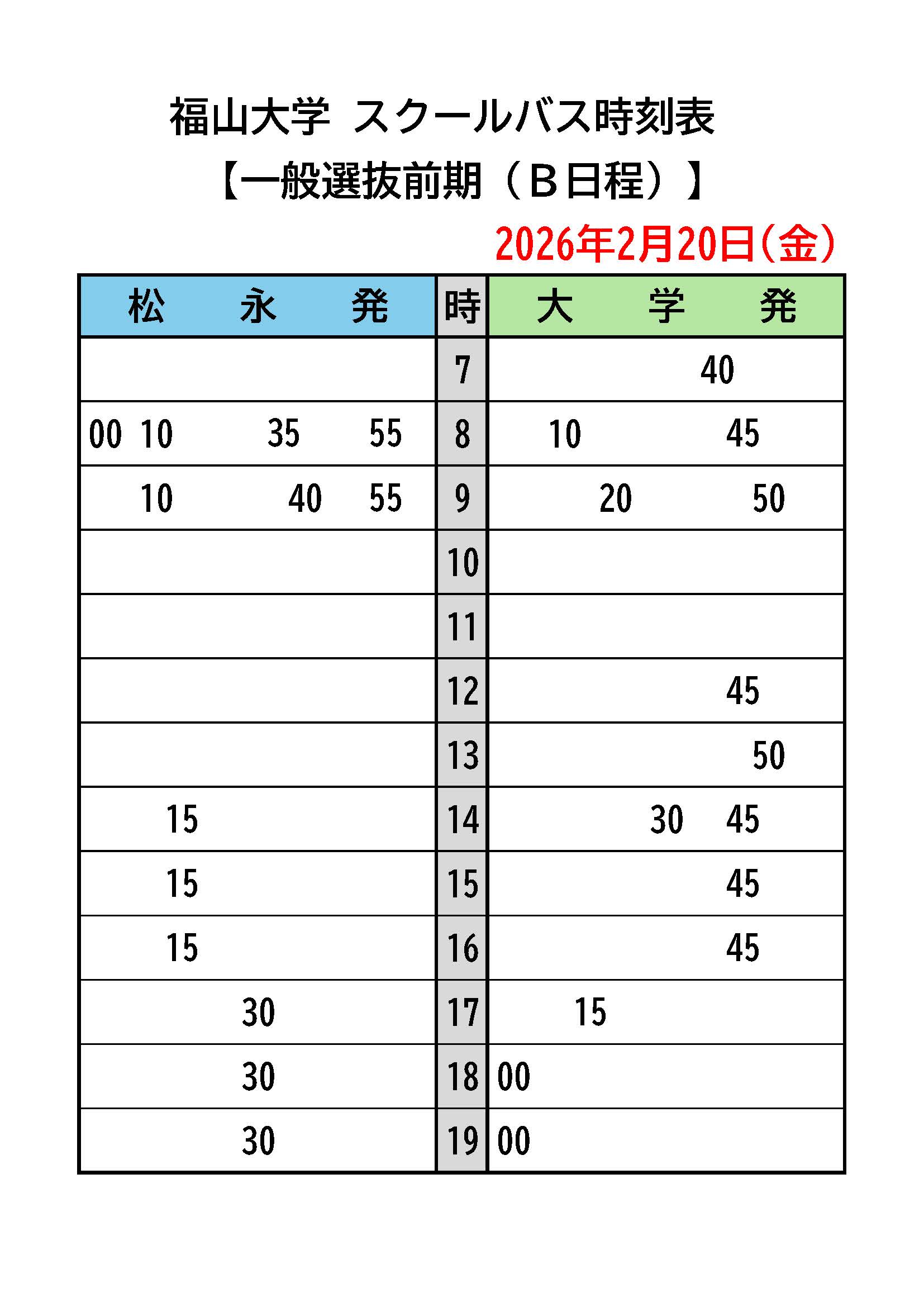 ・【 令和8年度 入学試験 一般選抜前期[B日程] スクールバス時刻表】