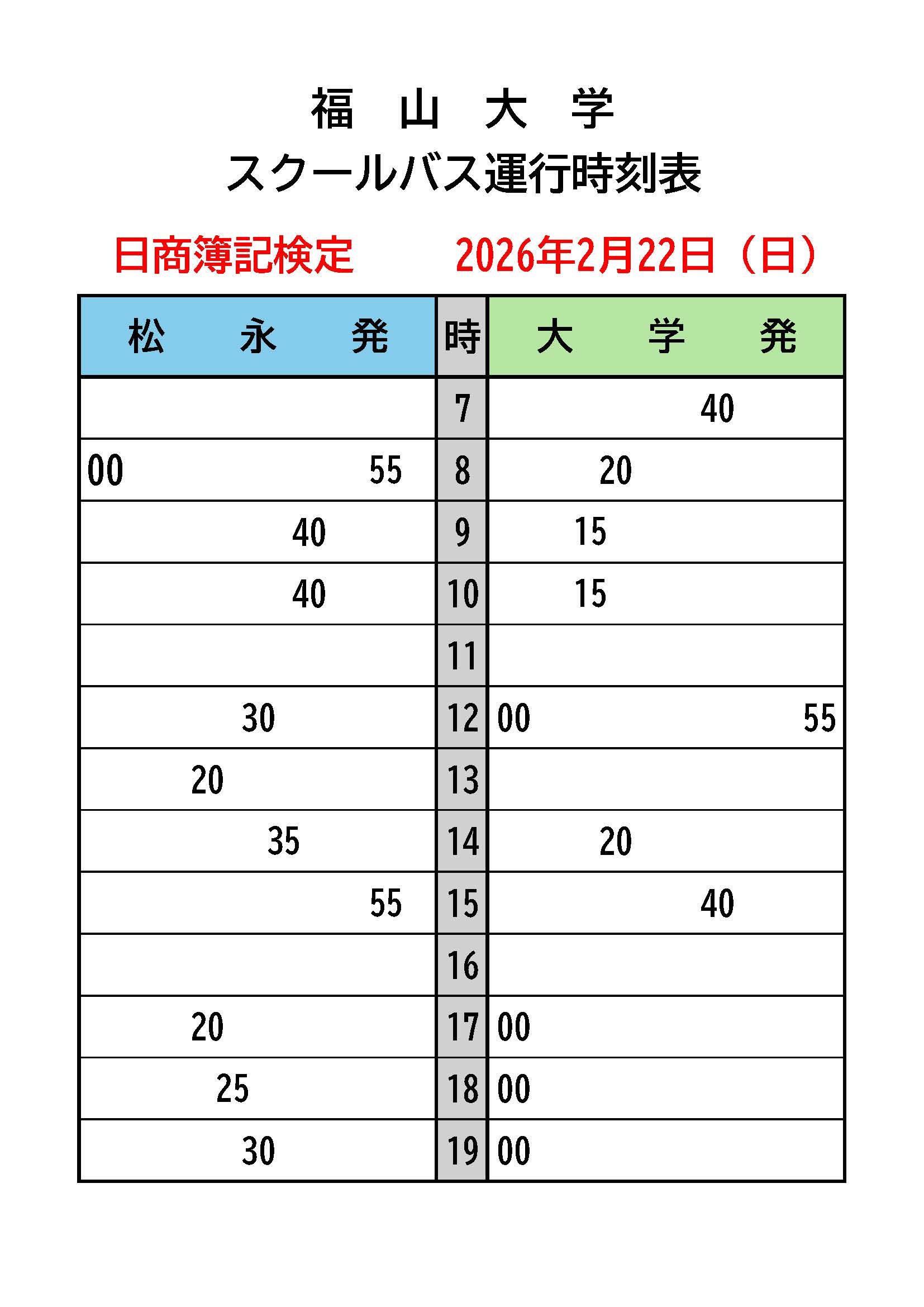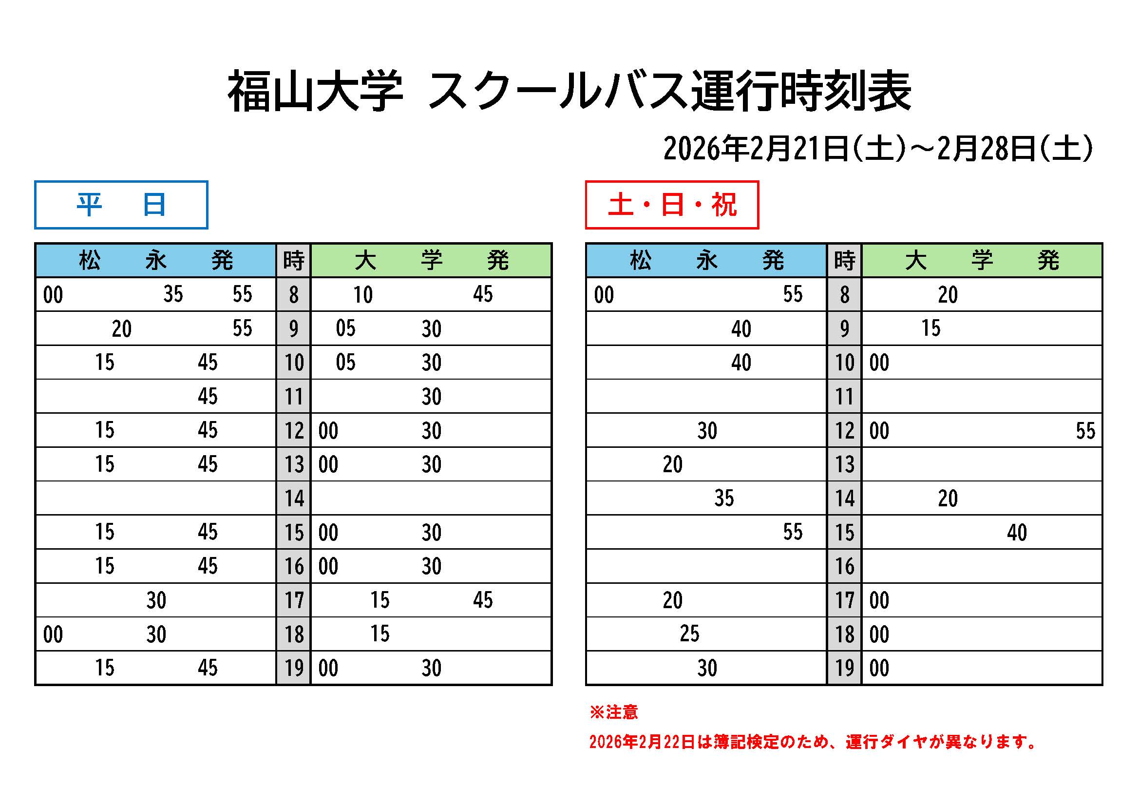 2026年2月22日(日)は簿記検定ダイヤです。ご注意ください。