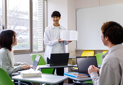 経済学の各分野をほぼ網羅した講義を提供します。経済理論はもちろん、会計学から経営学まであります。それらを幅広く学びながら、学生が興味を持つ専門を研究できます。必ず、興味を抱く分野を発見できるでしょう。しかも、経済学部には充実した教授陣がいて、一人ひとりにあった学びを支えます。