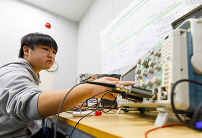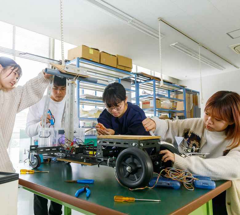 電気電子工学科、建築学科、情報工学科、機械システム工学科の4つの学科の力を結集した、1年次からの学科横断の多様なプロジェクト型授業で、知的好奇心を満たす新たな幅広い学びと、新たな仲間をつくります。