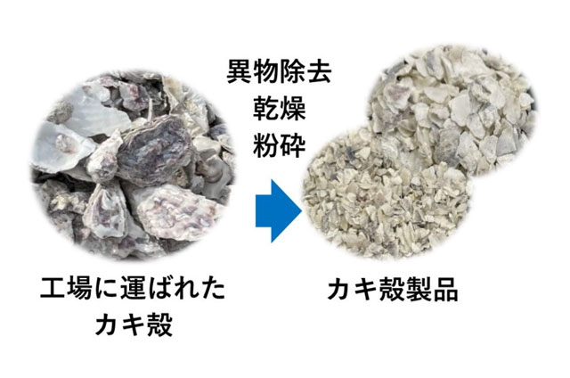 これまでの研究では、カキ殻をコンクリートに混ぜるために、まず処分場にあるカキ殻を細かく砕くところから始めていました。しかし、本研究では、広島県福山市にある企業が生産するカキ殻を使います。この材料は、工場できちんと品質管理されていて、粒の大きさや成分、水分の量などが安定しているのが特徴です。