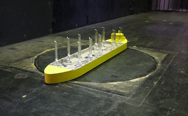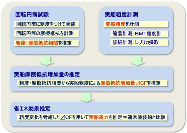 赤い色の塗料で塗られ船底部分は海水に接しているので、船が航走すると海水で擦られて摩擦抵抗を生じ、時には10~20%以上の燃料を余分に消費してしまいます。これを減らすことが省エネを実現するためには重要で、常に塗料は改良されていますが、塗装によって表面がでこぼこしたのでは、抵抗は減りません。船底の塗料と表面状態を計測して摩擦抵抗がどの程度になるかを推定する方法を開発しています。