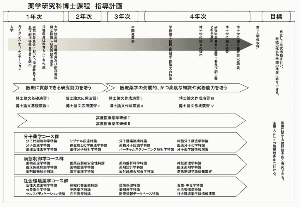- 1.分子薬学、病態制御学及び社会環境薬学の3つの分野を、横断型にて、関連した科目を含む講義及び医療薬学研修等を統合的に履修する。