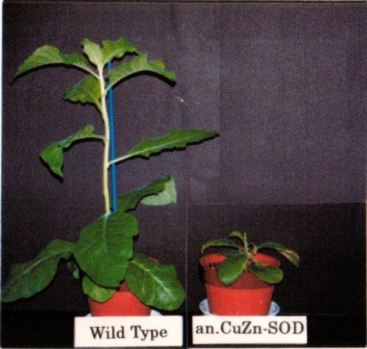野生型(左)と光ストレスに関する変異を導入した植物(右)。