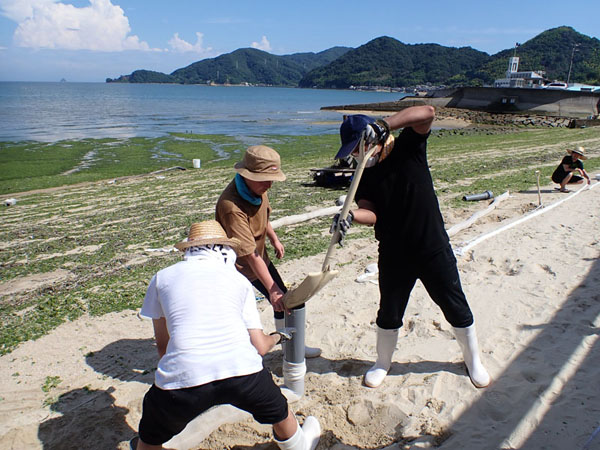 瀬戸内海の穏やかな海岸には砂泥地が広がり、海草アマモによる「アマモ場」がよく発達します。しかし、開発や環境悪化によって、瀬戸内海のアマモ場は減少してきました。 私たちは地元の企業と連携して、2022年から因島でアマモ場を再生する研究をスタートさせました。アマモを良好に生育させるために底質を安定化する技術や、アマモの生長を促進する技術の実証実験に取り組んでいます。