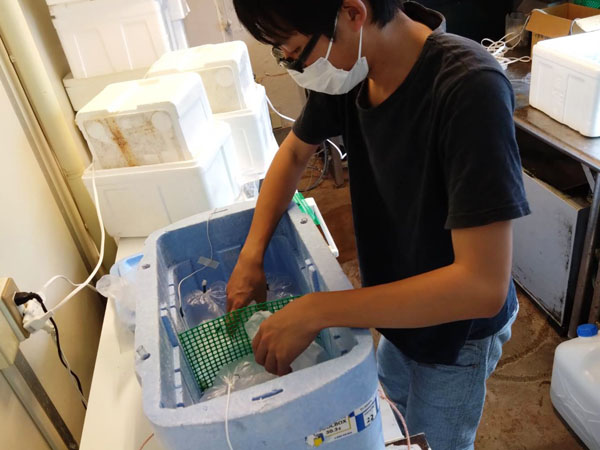 キジハタの寒冷麻酔実験に取り組む学生
