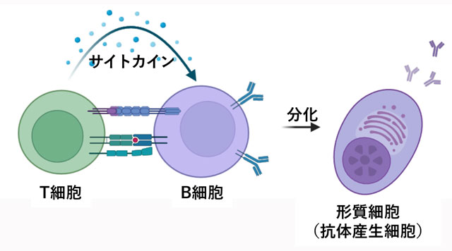 B細胞はT細胞からのシグナルやサイトカインによって抗体を分泌する形質細胞に分化します
