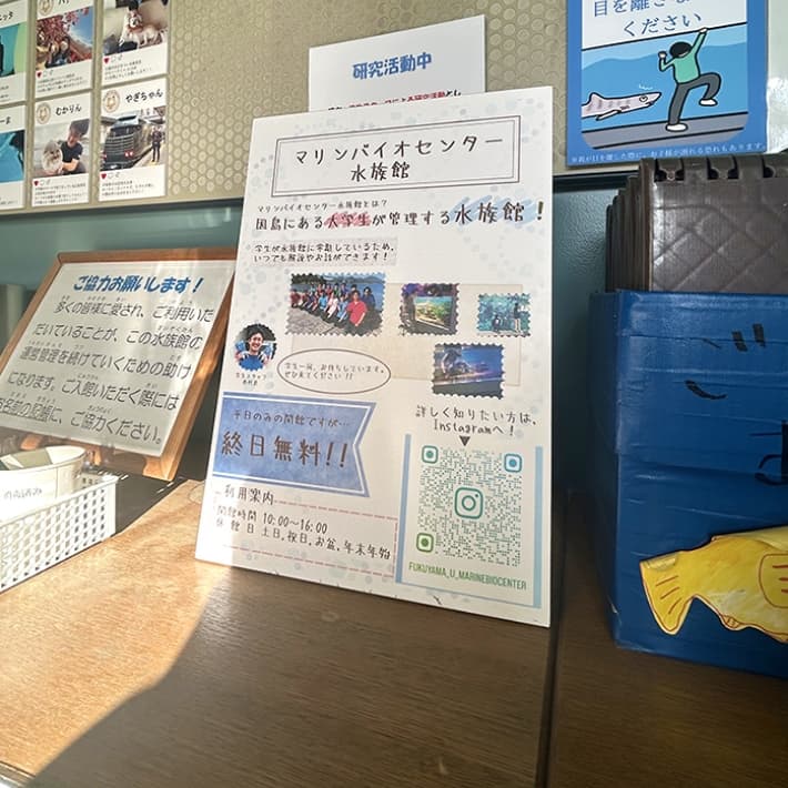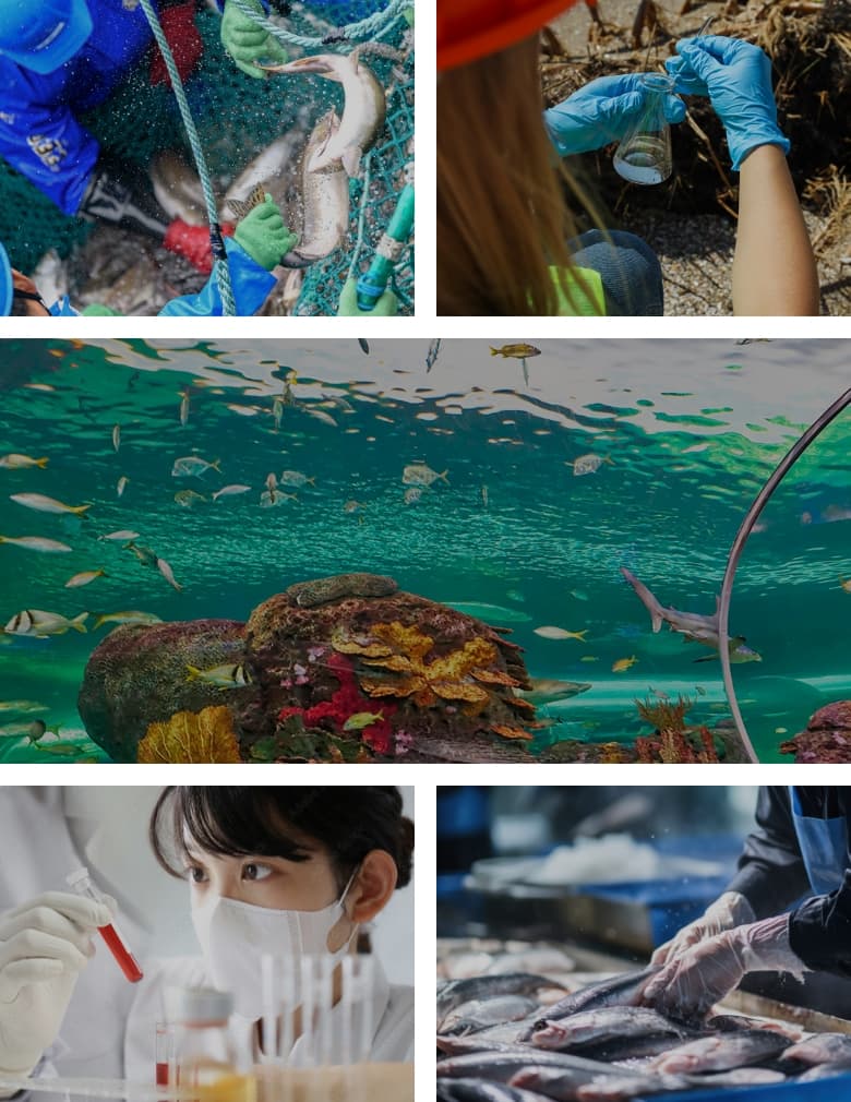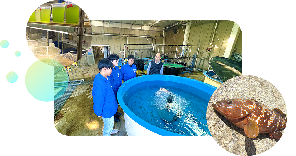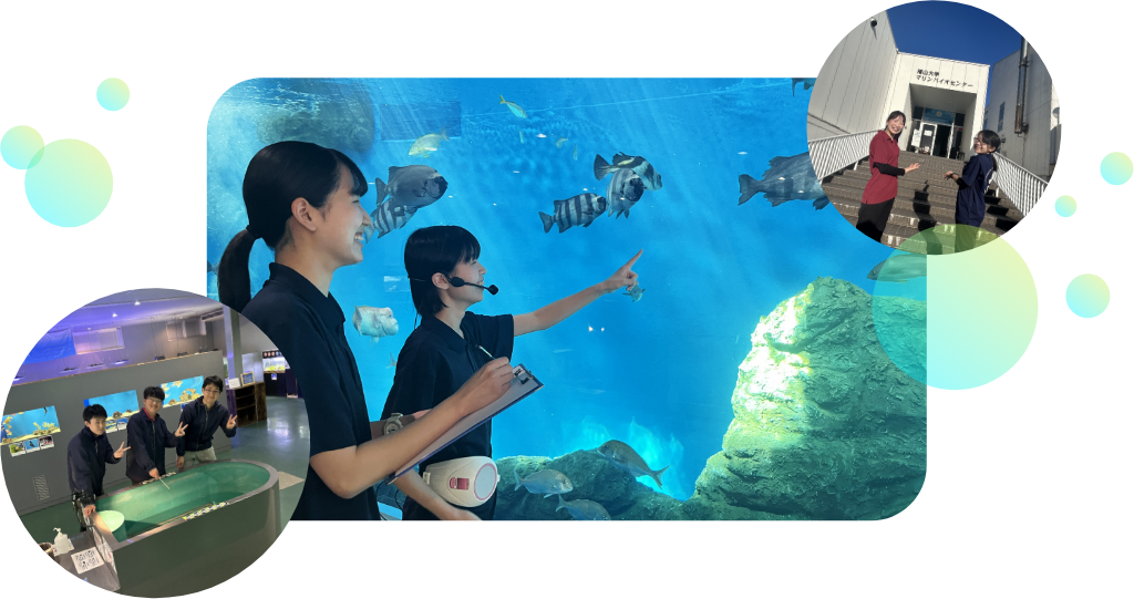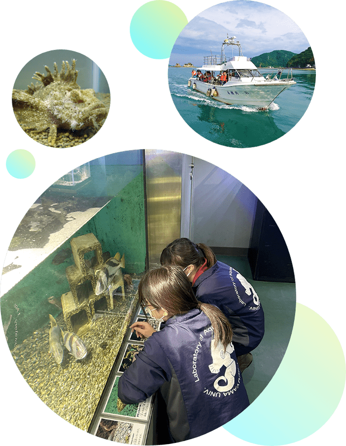 また、内海生物資源研究所には、150トンの大水槽をはじめ約20の展示水槽およびバックヤードを有する附属水族館や、大規模な魚介類の飼育設備などが整備されており、学生実験や卒業研究に活用されています。