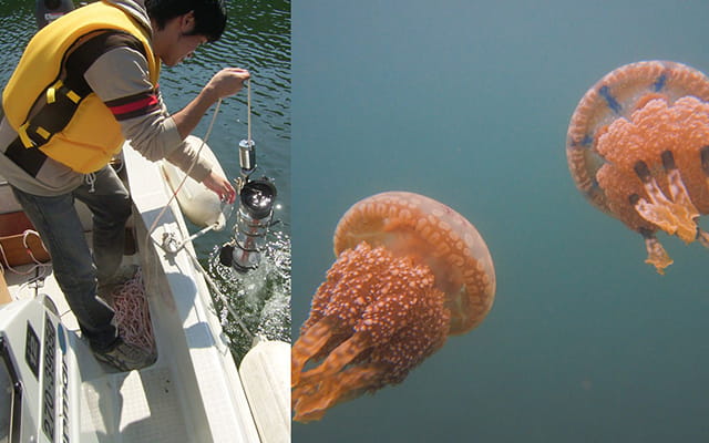 海岸での海洋生物調査、船舶を用いた環境調査や生物採取など、環境や動植物の生態を実感できる学生実験や卒業研究を行っています。